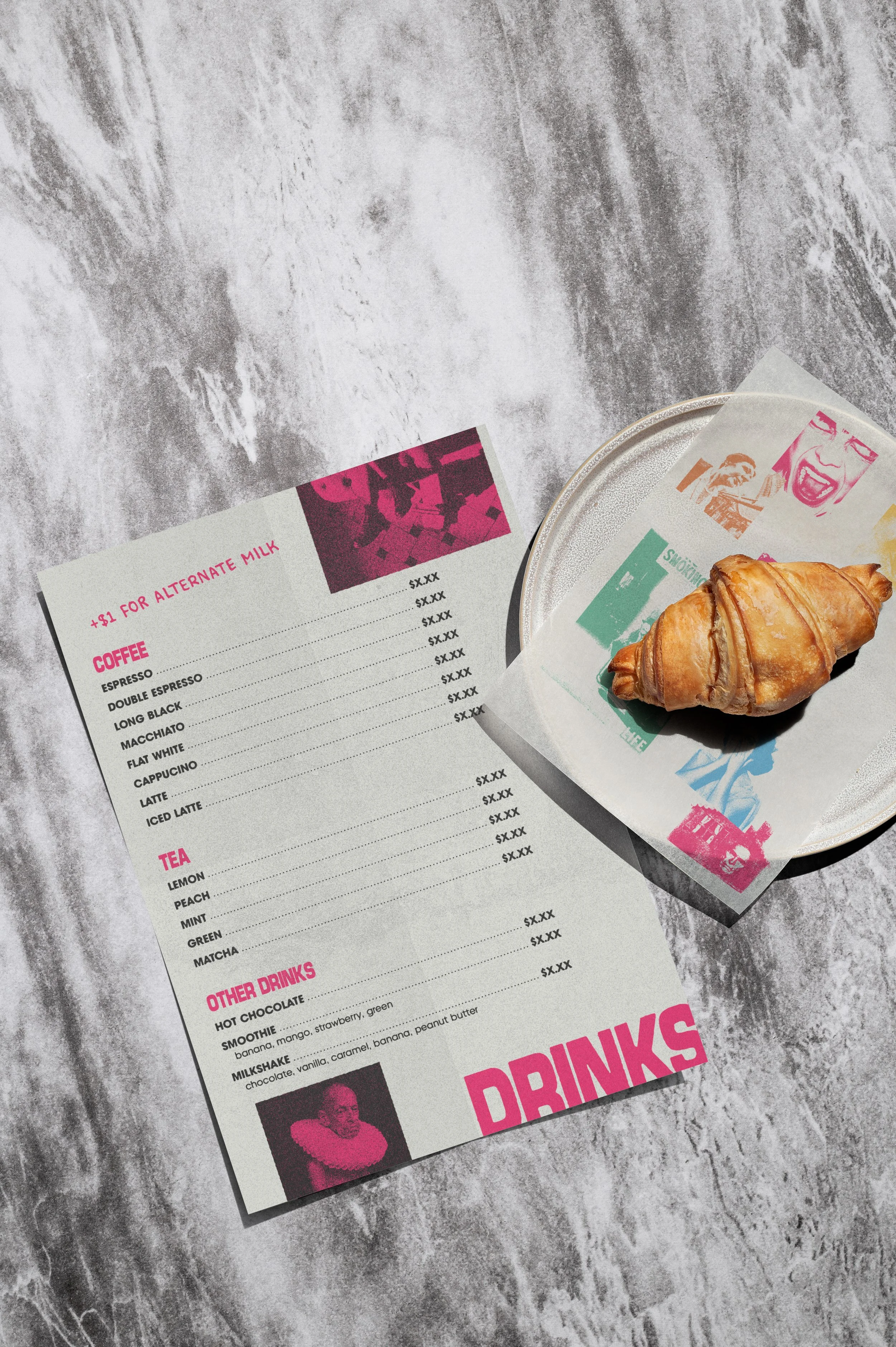 This involved creating a brand identity document for future designs, as well as figuring out what examples would be required for a cafe/bar (such as menus, takeaway cups, and event posters).